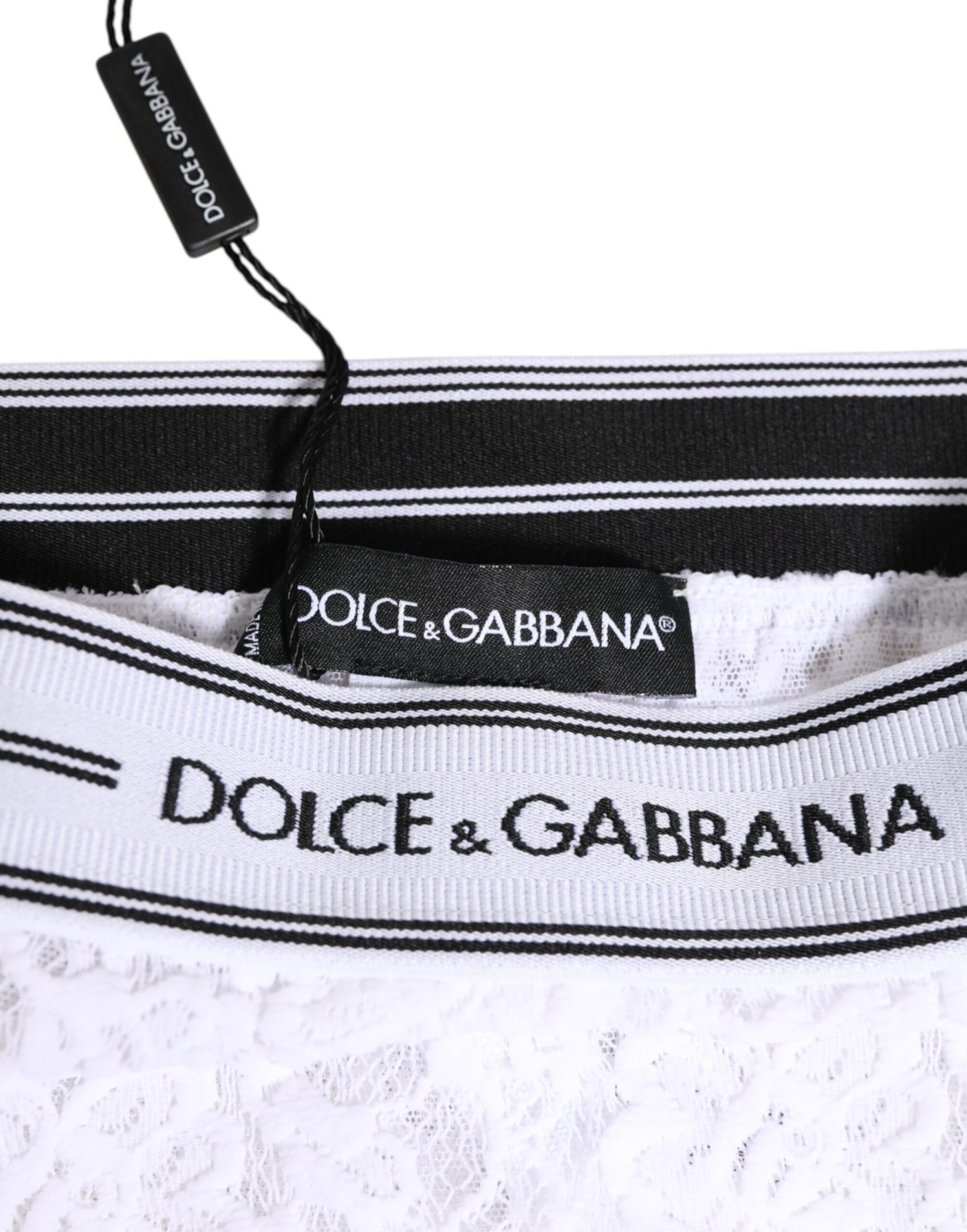 Ein wunderschöner, brandneuer und 100 % authentischer Slip von Dolce & Gabbana. Vervollkommnen Sie Ihre Lingerie-Sammlung mit diesem edlen weißen Spitzen-Slip. Er ist mit einem elastischen Logo-Bund und zarter floraler Spitze gestaltet und verbindet so Eleganz und Komfort.