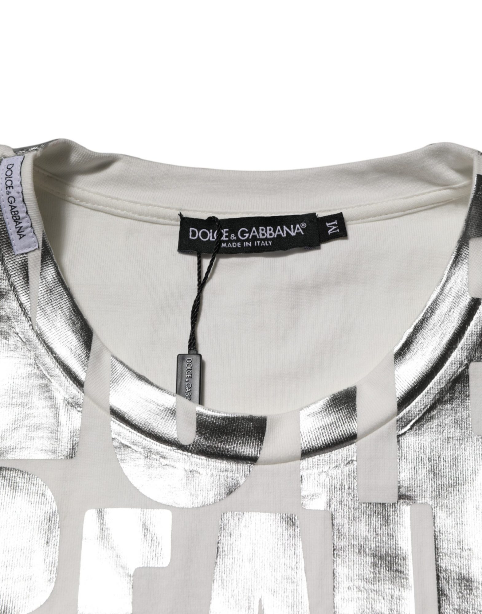 Wunderschönes, brandneues, 100% authentisches T-Shirt von Dolce & Gabbana aus reiner weißer Baumwolle mit einem auffälligen Slogan in Silbermetallic auf der Vorderseite. Mit klassischem Rundhalsausschnitt und kurzen Ärmeln kombiniert dieses Stück modernen Chic mit Alltagskomfort. Perfekt, um lässige Outfits mit einem auffälligen Designer-Touch aufzuwerten.